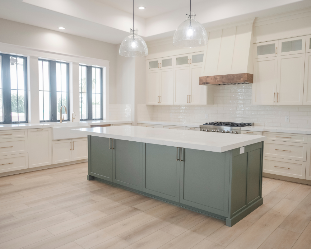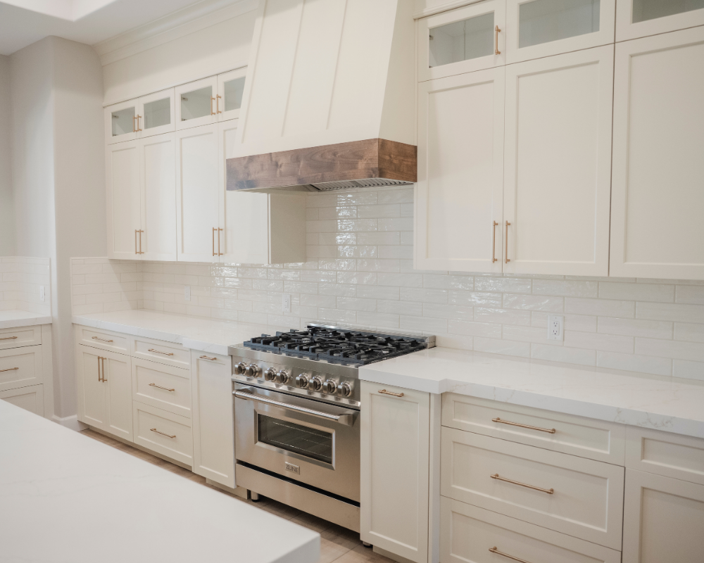 - Knotty alder raised panel 54″ cabinets in kitchen