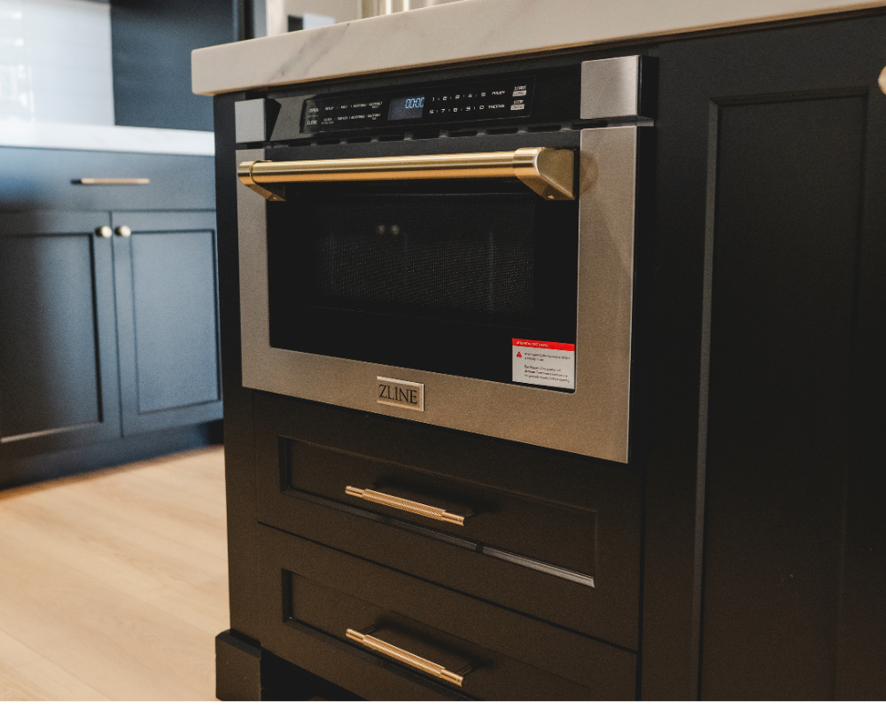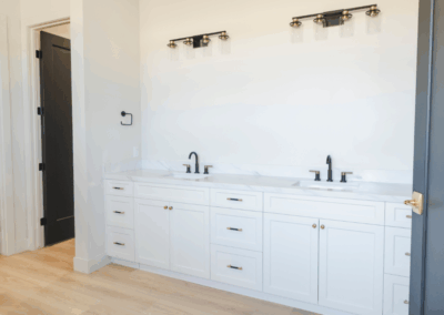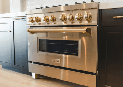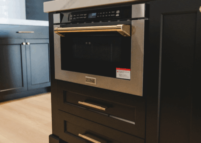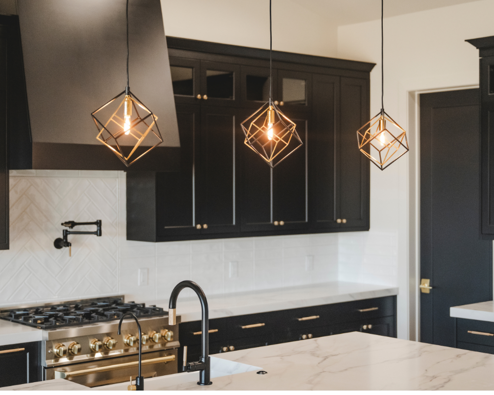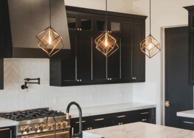 This home features black cabinets in the kitchen, adding a touch of modern elegance and sophistication to the space. We added luxury and warmth pairing it with gold accents The wood floors play a crucial role in brightening up the home, providing a natural and inviting atmosphere. Modern light fixtures enhance the overall design, offering both functionality and style, making the space feel contemporary and welcoming.